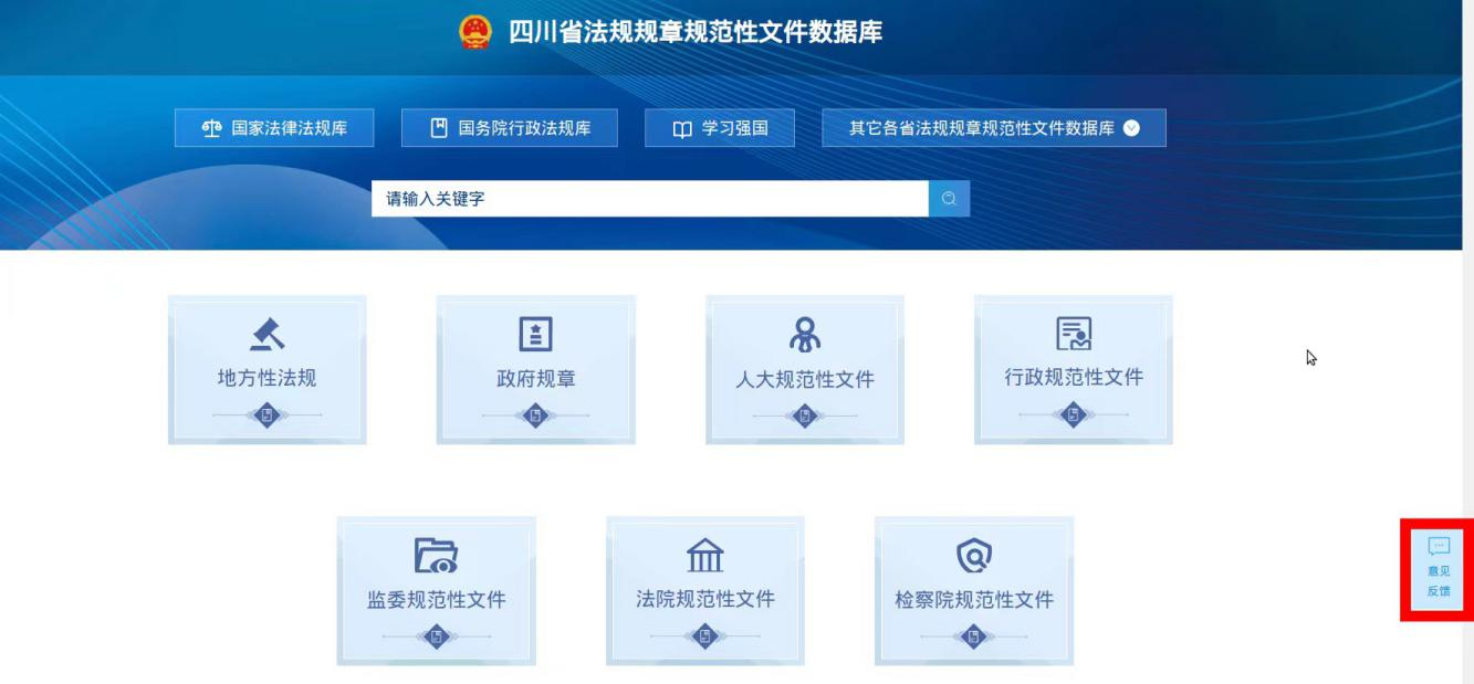 登录方式二:在四川省法规规章规范性文件数据库(https://rhpt.scspc.gov.cn/flfgkgzd)首页右下角,点击“意见反馈”进入登录页面。